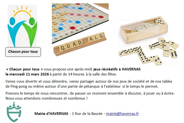 « Chacun pour tous » vous propose un après-midi jeux récréatifs à la salle des fêtes d’HAVERNAS le mercredi 11 mars 2026 à 14 heures